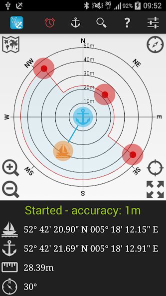 هذا تطبيق مرساة ، إنه سهل الاستخدام للغاية ، يمكنك ببساطة تنشيط التطبيق بعد أن أسقطت المرساة وإعداد القارب. ليس عليك أن تعرف الإحداثيات الدقيقة للمرساة ، فأنت بحاجة فقط إلى المحمل والمسافة إلى المرساة الخاصة بك ، هذا كل شيء.